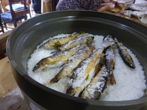 先ずはホサナ名物?「あゆごはん」。 塩焼きにした天然アユを贅沢にご飯に投入。 お酒をまぶして頂きます。 なかなかダイナミックな調理法なのに、上品な香りと味覚を楽しめます。